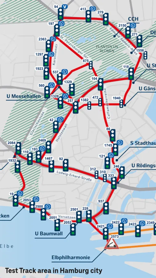 The Traffic Light Assistant Hamburg provides phase and forecast information about traffic lights in the city center of Hamburg.