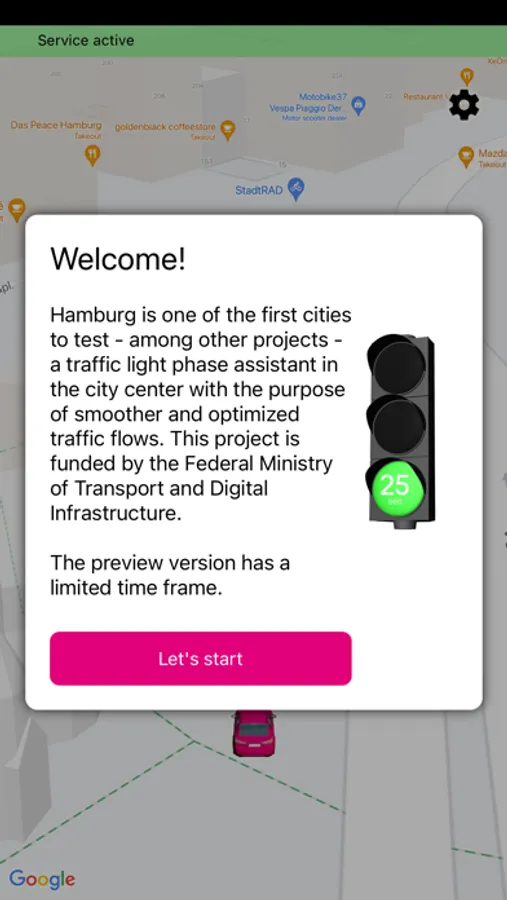 The Traffic Light Assistant is a location and map-based service. The service determines the traffic light systems relevant to the user based on the position of the user and his driving direction and provides signal phase information and a forecast of the next change of phase of the traffic light. The service can be configured as driving a car, e-scooter, bicycle, or truck, to indicate the driver the appropriate speed level. By providing the traffic light data in advance the app will support a more relaxed driving behavior and can positively influence the traffic flow. Furthermore, an additional collision warning function is integrated. It calculates possible future collisions of road users based on the position and trajectories of several users in a so-called accident hotspot (e.g. at an intersection). Road users are warned in good time before the collision with other road users will happen or notified of unavoidable collisions with an emergency warning.