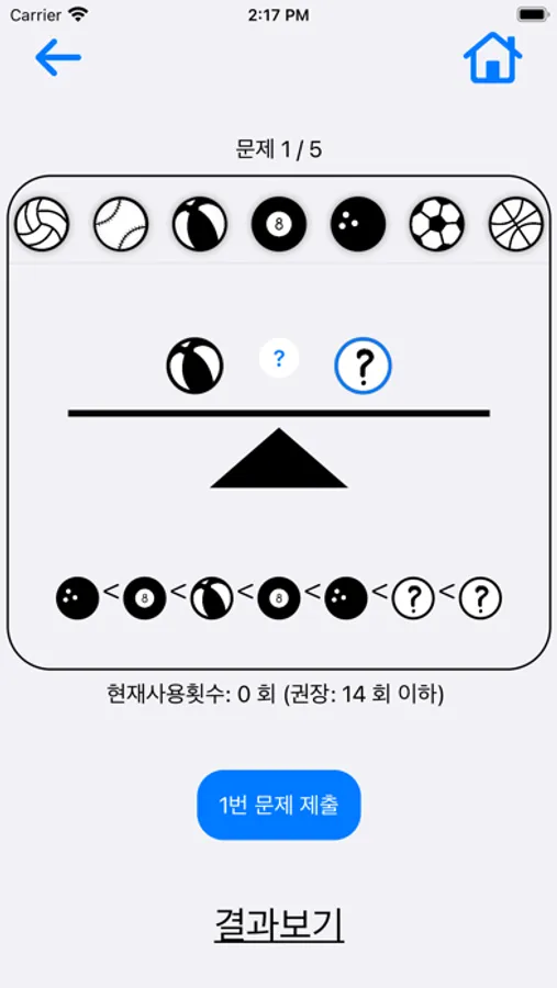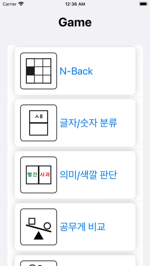 N-Box, 글자/숫자 맞추기, 의미/색깔 맞추기, 공 무게 재기, 가위바위보 게임