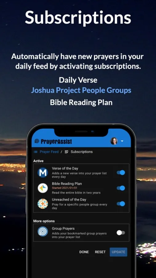 • Optionally import prayers from third-party sources including verse of the day, a bible reading plan, and the Joshua Project