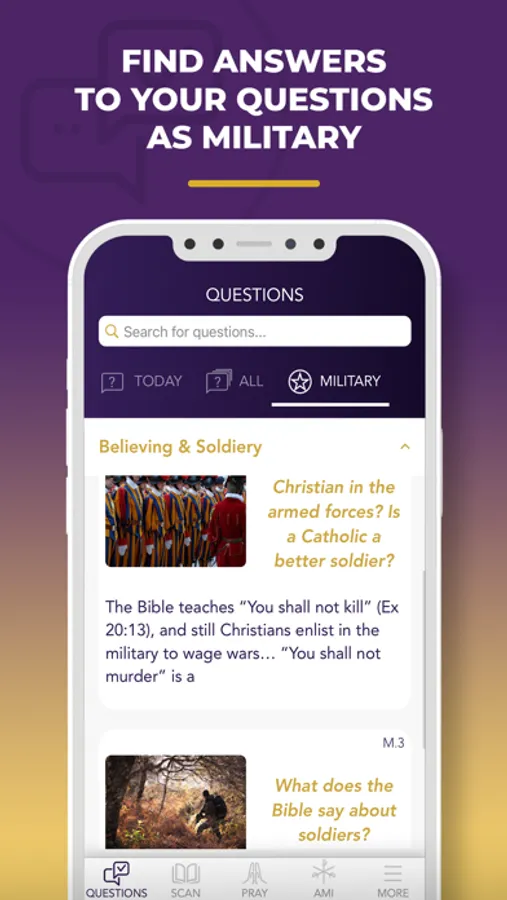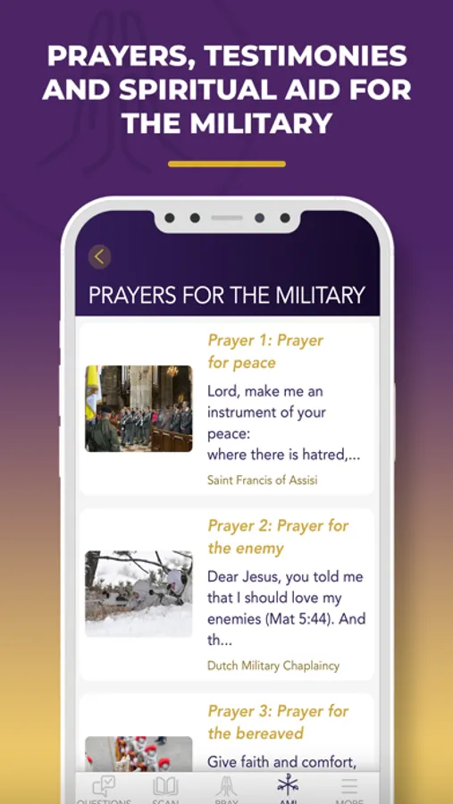 This app is an initiative of the Apostolat Militaire International (AMI) executed in close collaboration with Tweeting with GOD (#TwGOD) to help individual soldiers, sailors, and airmen to find answers to their questions and grow in their faith.