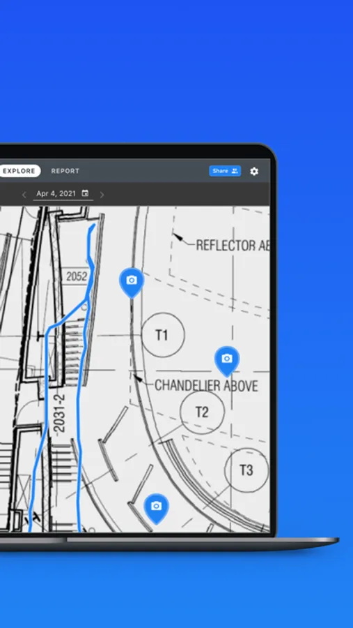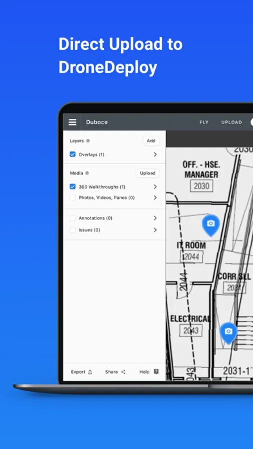 Once uploaded, your 360 captures will process in DroneDeploy for a complete walkthrough. From there you are able to share with your team, compare over time, inspect, and markup.