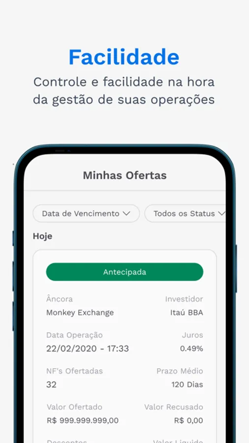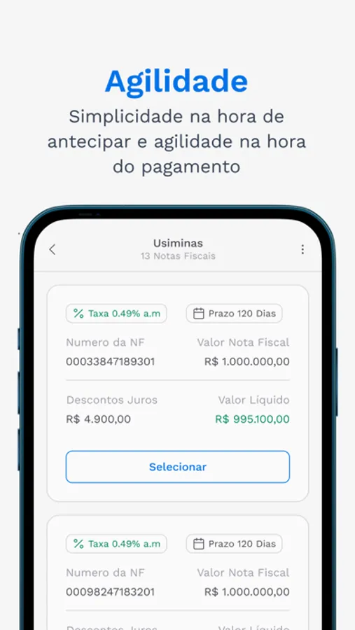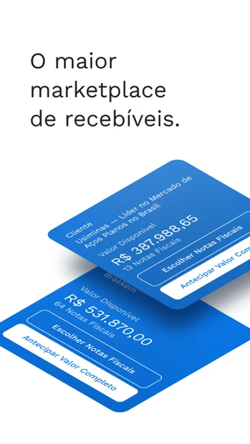 As nossas soluções conectam grandes empresas, que são nossos clientes, e seus fornecedores, junto a instituições financeiras, para ajudar a encontrarem as taxas mais justas para antecipar as suas notas fiscais.