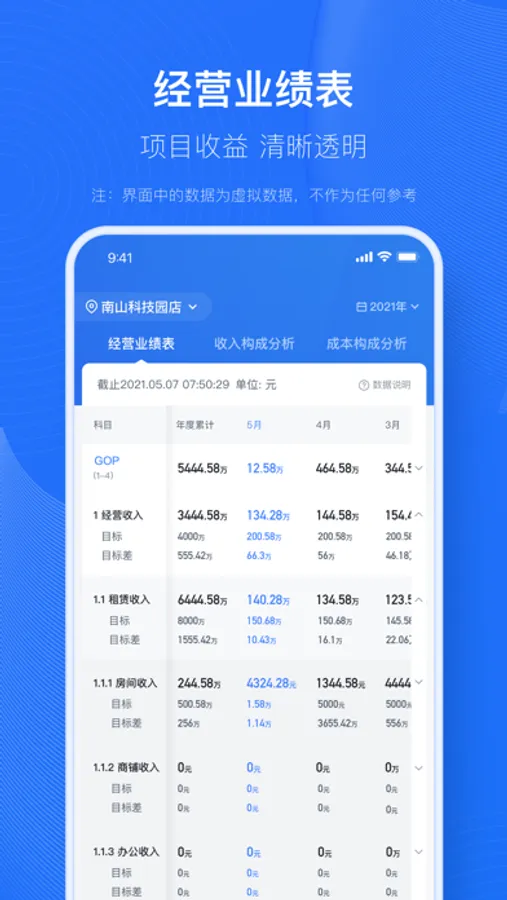 【经营业绩】展示项目每月、年累计的经营业绩表,可查看每一项收入、成本支出数据明细,项目收益,一目了然;