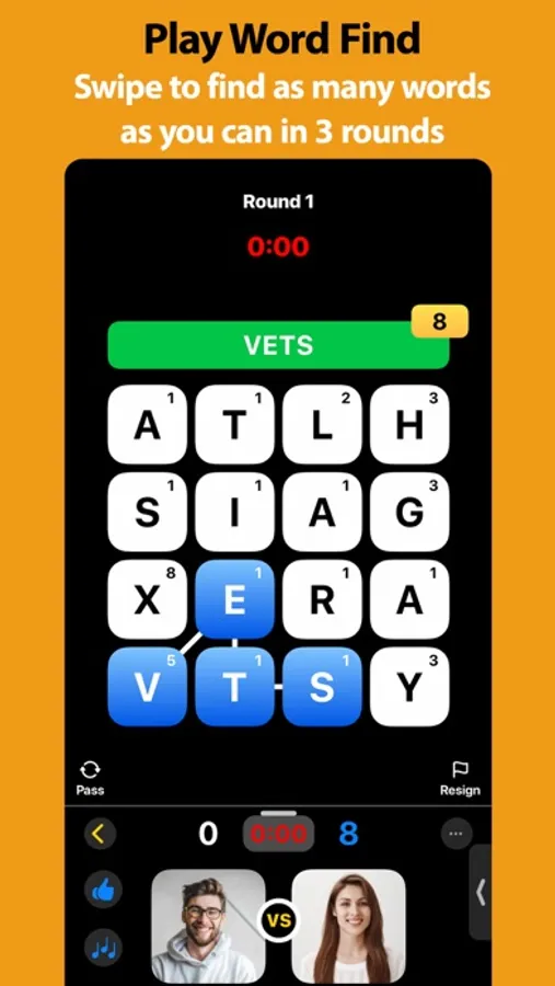 • Word Find - swipe through 3 rounds of fast paced word finding!