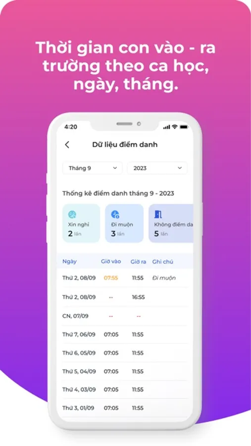 Xem thời gian con vào - ra trường theo ca học, ngày, tháng.