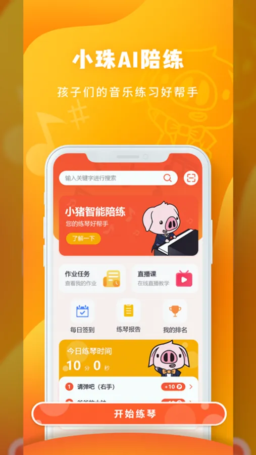 “小猪智能陪练”APP,是针对4-16岁的钢琴初级学习者(1-6级)研发的一款学生钢琴AI陪练工具工具产品。通过AI智能声音识别功能,为学生提供纠错、打分、伴奏等辅助学习手段,帮助钢琴学童在趣味的学习模式中积极练习。