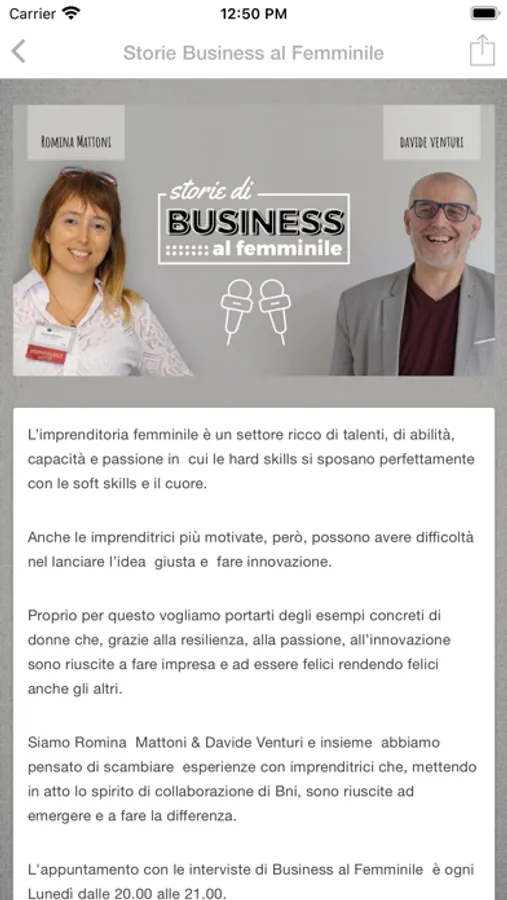 L’imprenditoria femminile è un settore ricco di talenti, di abilità, capacità e passione in cui le hard skills si sposano perfettamente con le soft skills e il cuore. Anche le imprenditrici più motivate, però, possono avere difficoltà nel lanciare l’idea giusta e fare innovazione. Proprio per questo vogliamo portarti degli esempi concreti di donne che, grazie alla resilienza, alla passione, all’innovazione sono riuscite a fare impresa e ad essere felici rendendo felici anche gli altri. Siamo Romina Mattoni & Davide Venturi e insieme abbiamo pensato di scambiare esperienze con imprenditrici che, mettendo in atto lo spirito di collaborazione di Bni, sono riuscite ad emergere e a fare la differenza. L'appuntamento con le interviste di Business al Femminile è ogni Lunedì dalle 20.00 alle 21.00. Puoi partecipare alla Zoomcall e interagire con noi o seguire la diretta dalla Pagina Facebook di Diventa Veloce. Qui sotto il link per collegarsi Unisciti a noi 10 minuti prima dell'inizio così riusciamo a presentarci e siamo sicuri di iniziare puntuali. Il nostro più grande desiderio con questo progetto? Farti portare a casa validi spunti per concretizzare la tua idea di business realizzando il tuo sogno imprenditoriale!