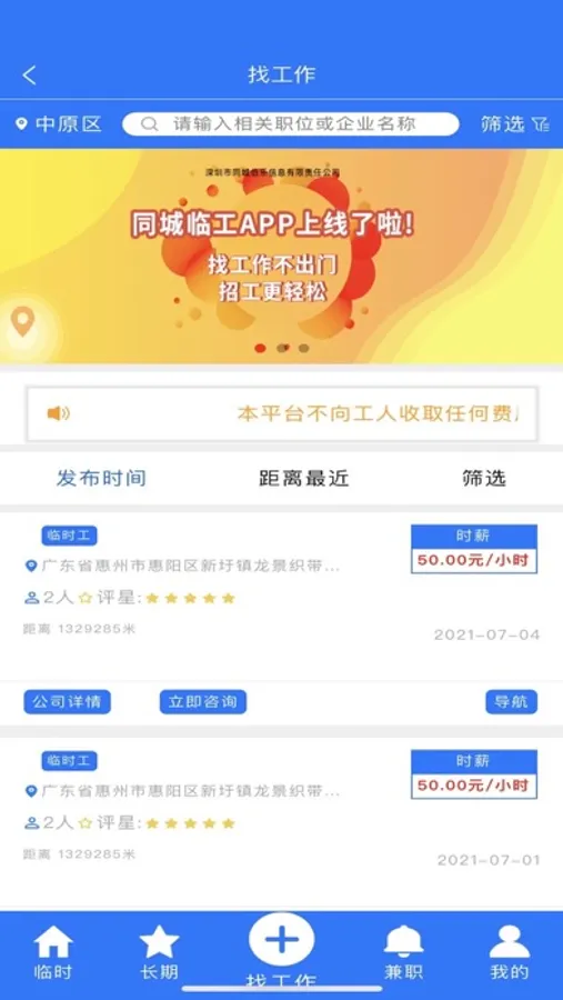 同城临工不公仅仅是一个信息平台,更是一个服务平台,目的是颠覆传统用工模式利用最先进的互联网科技,采用人工智能大数据,云计算精准推送,APP自带定位功能,方便求职者无障碍选择工厂。