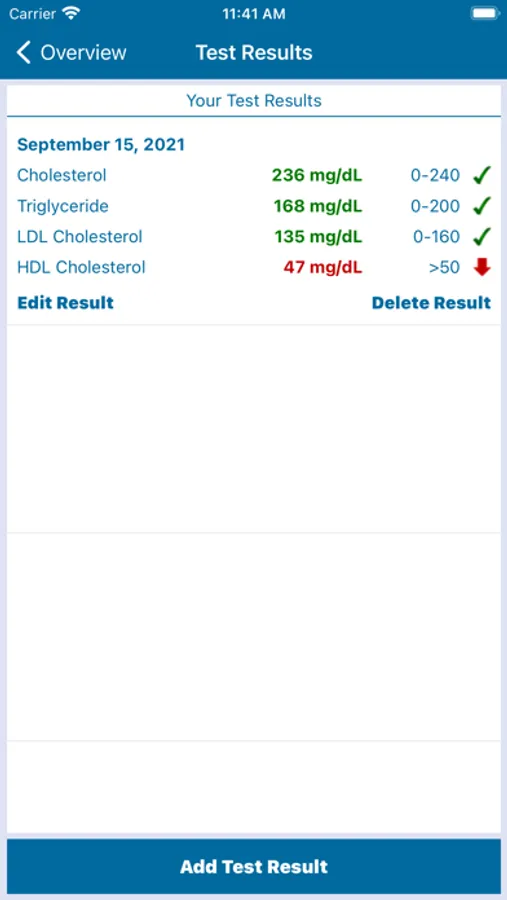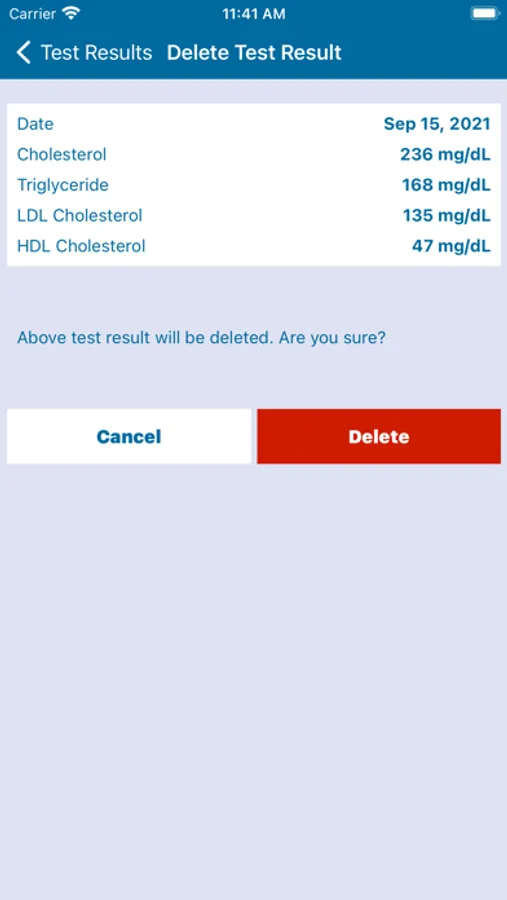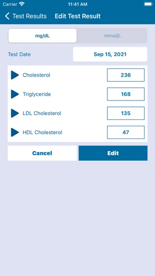 - Storing, editing and deleting your Lipid Panel test results (Cholesterol, Triglyceride, LDL and HDL Cholesterols)
