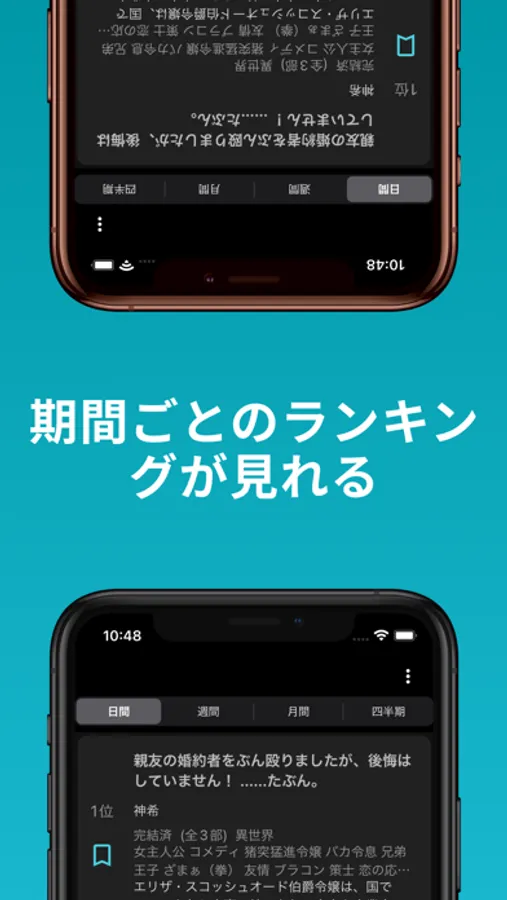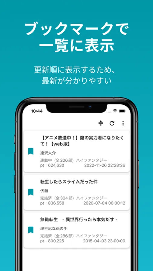・検索結果またはランキングの一覧に表示されている小説のブックマークアイコンを押下することで、ブックマークに保存されます(オフライン機能はありません)