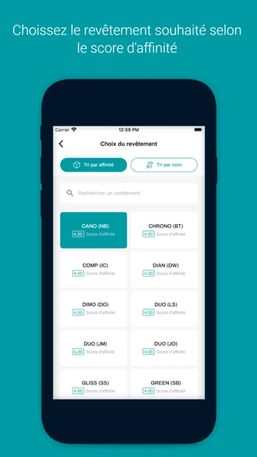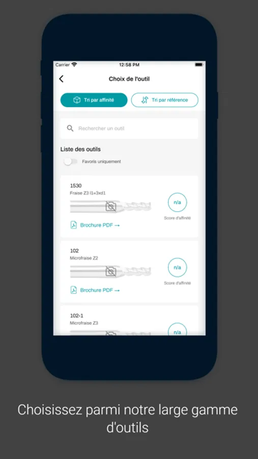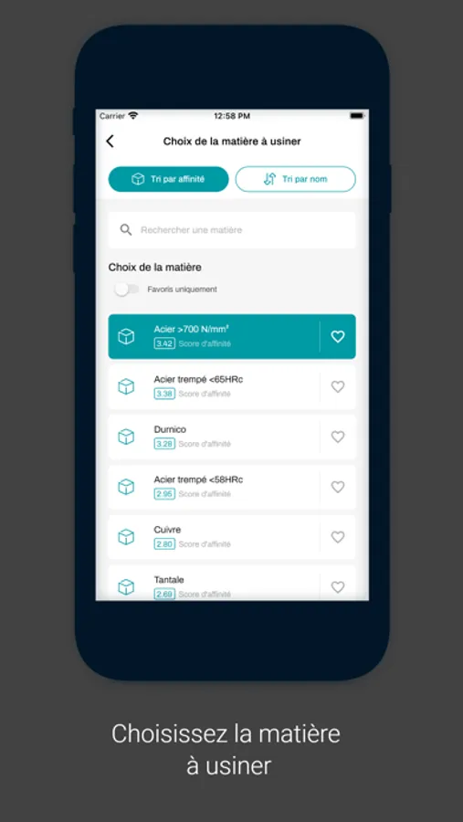 L'application vous suggère le meilleur ouil, le meilleur revêtement ainsi que la meilleure matière à usiner en fonction de votre sélection à l'aide d'un score d'affinité calculé automatiquement.