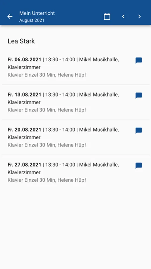 Alle Funktionen zum Austausch von Nachrichten zwischen Lehrkräften, Eltern und Schülern und der Musikschule setzen keinerlei Kontaktinformationen voraus. Die Übermittlung von Nachrichten erfolgt über eine App-interne ID. Zum Chat und Nachrichtenaustausch sind keine E-Mail-Adressen oder Handynummern erforderlich! Natürlich werden auch alle Daten DSGVO-konform und verschlüsselt in einem zertifizierten Rechenzentrum in Deutschland gespeichert.