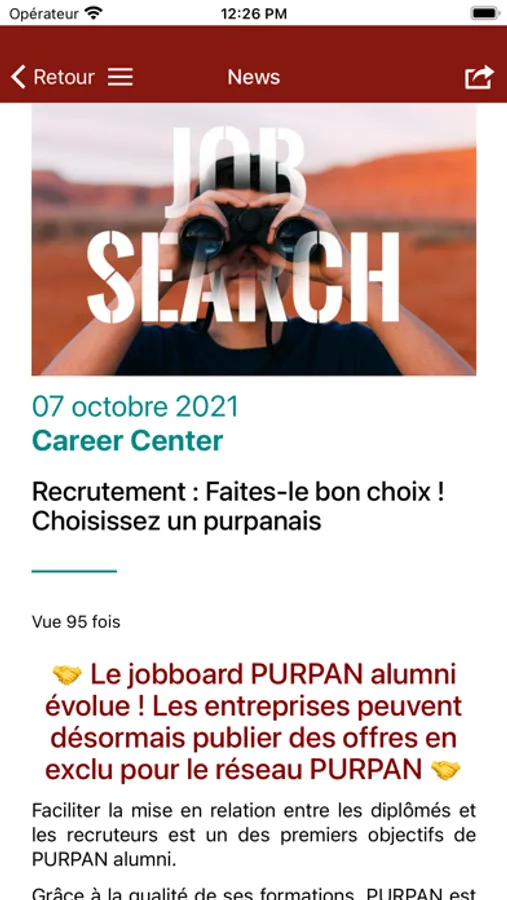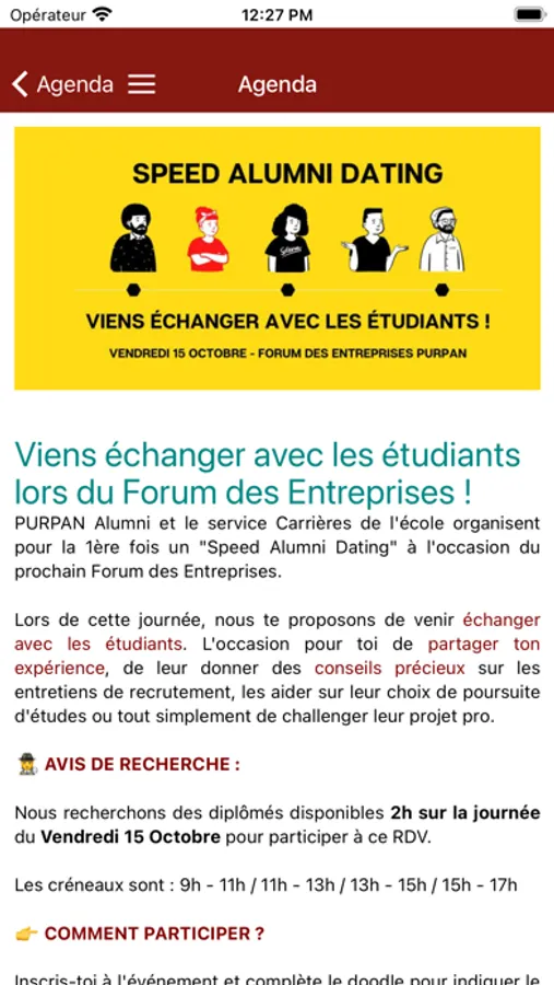 Accédez à l’ensemble du réseau grâce à l’application PURPAN alumni sur smartphones et tablettes. Restez à l’écoute des opportunités de carrières et de business de votre secteur en consultant les offres d’emploi, accédez à l’annuaire en ligne et découvrez les diplômés autour de vous grâce à la fonction géolocalisation, suivez l’actualité du réseau, mettez à jour votre profil …. Rien de plus simple, téléchargez l’application PURPAN alumni et commencez à réseauter !