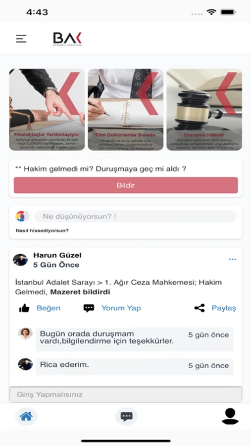 • Gönderi ve Mesajlaşma: Sistemi kullanan avukatların mesajlarına cevap vermek, yorum yapmak, beğenmek ve paylaşmak mümkün. Dilediğiniz taktirde mesajlarınızı özel olarak da gönderebilirsiniz.