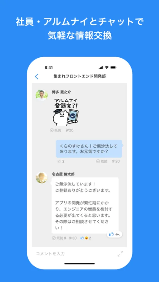 アルムナイや社員とスタンプやメッセージのやり取りができます。SNSで気軽な情報交換が可能です。