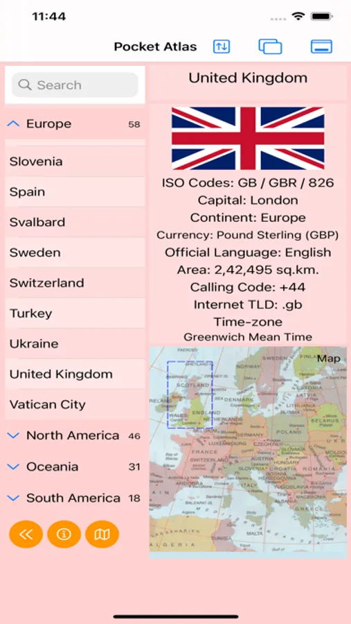 You can show/hide the views and swipe them left/right, if required zoom on the map. You can group the countries by continents, regions, time-zones, etc. You can sort the countries by their names, areas, etc.