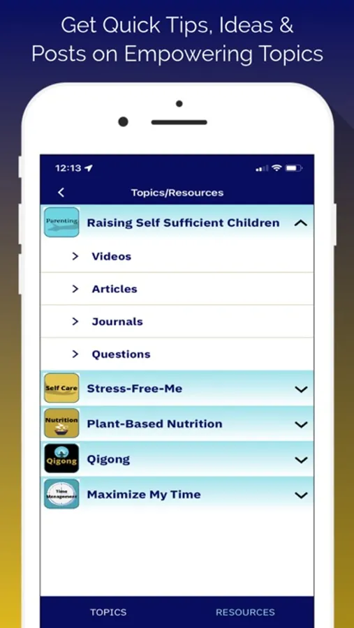 The Parenting Potential app offers videos, articles, journal prompts, a gallery of motivational images, courses, and a directory of resources all designed to support you. These are organized into topics so you can focus on what you are interested in. The initial topics include Plant-Based Parenting, Parenting Self-Sufficient Children, Stress Free Self-Care, Qigong, and Maximize My Time.