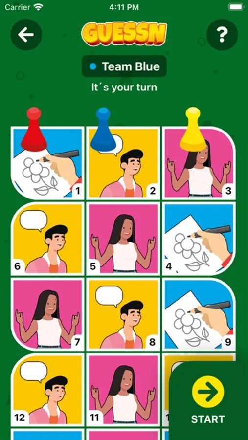 Guessn is a board game for 4-16 players in which players in teams have to pantomime, draw, explain and guess terms together.