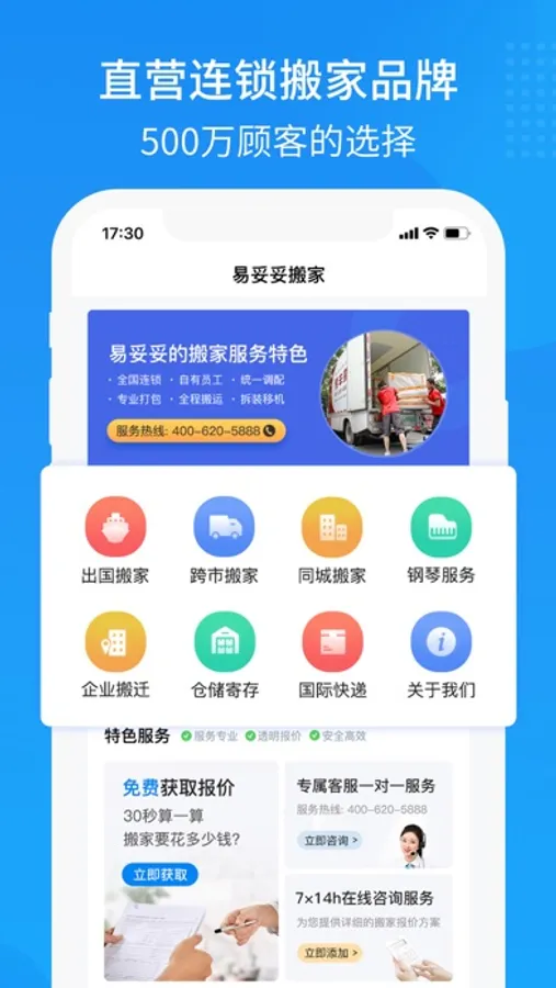 易妥妥搬家--专注搬家!全国连锁品牌,统一收费标准,明码标价,满意再付款!易妥妥搬家主营跨市搬家、同城搬家、出国搬家、办公室搬迁、钢琴服务等搬家业务。我们是一家专业的全国连锁搬家公司,服务网点覆盖全国230多个城市和地区;简单透明的计费规则更省心,线上支付搬家费用更便捷,明码标价让您更放心;提供上门打包、拆装、搬运、送货上门、按需还原等服务,高性价比搬家服务,让您更安心。如果服务结束后您对我们服务满意,请帮忙奔走相告;如果不满意请评价订单、致电我们400或微博、微信公众号私信我们,我们会立刻处理,谢谢您的支持!总之,易妥妥搬家为您服务是我们莫大的荣幸!搬家热线:400-620-5888