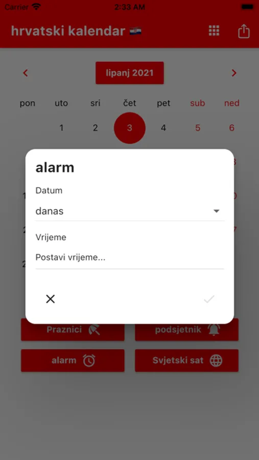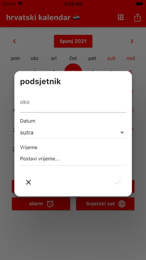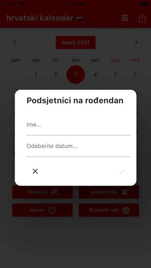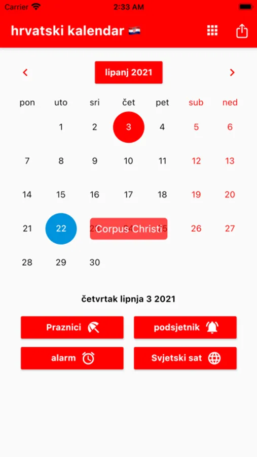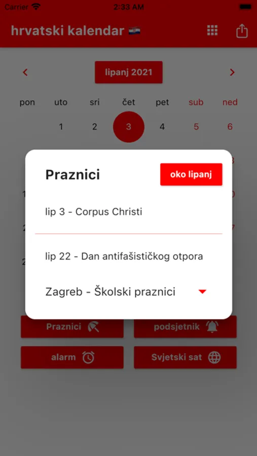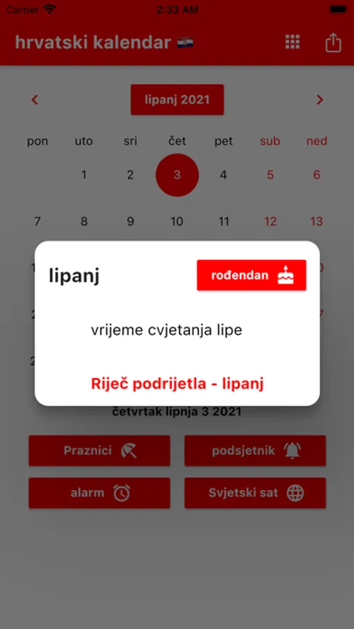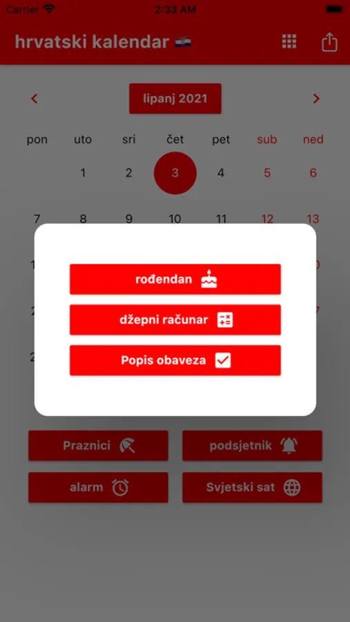 Možete postaviti podsjetnike i primati obavijesti u pravo vrijeme. Podsjećamo vas na Hrvatske blagdane. Možete registrirati rođendane svojih prijatelja i obitelji kako biste bili unaprijed obaviješteni. Uključeni su praktični alati poput kalkulatora, svjetskog sata i alarma. Svjetski sat prikazuje vrijeme u različitim gradovima svijeta. Naš kalendar sadrži popis obaveza s poviješću podrijetla svakog mjeseca. Hrvatska po lokalnom vremenu. Prevoditelj.