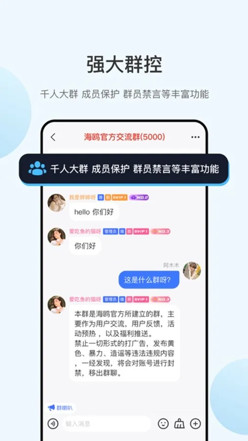 【强大群控】千人大群,成员保护,群员禁言等丰富功能;