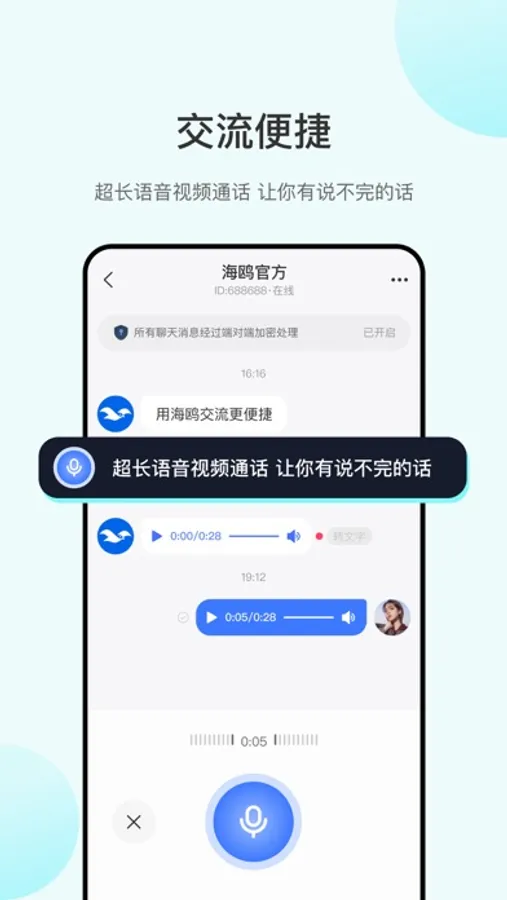 海鸥app是一款高效便捷,且安全可靠的加密即时通讯社交软件。