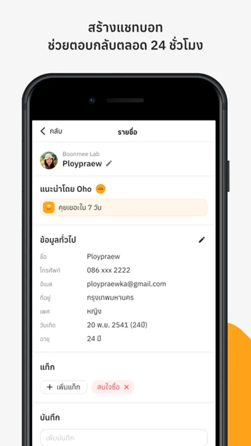 3. รายชื่อ: จำลูกค้าได้ บันทึกข้อมูลลูกค้าอัตโนมัติ ติดแท็ก จัดกลุ่ม สามารถดาวน์โหลดข้อมูลเพื่อนำออกไปวิเคราะห์ได้
