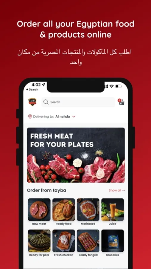 - يقدم تطبيق طيبة جورميه أول تجربة شراء عبر الإنترنت في الإمارات العربية المتحدة للمنتجات مصرية ، لحوم طازجة نيئة ، لحوم متبلة ، مشاوي و صواني فرن)