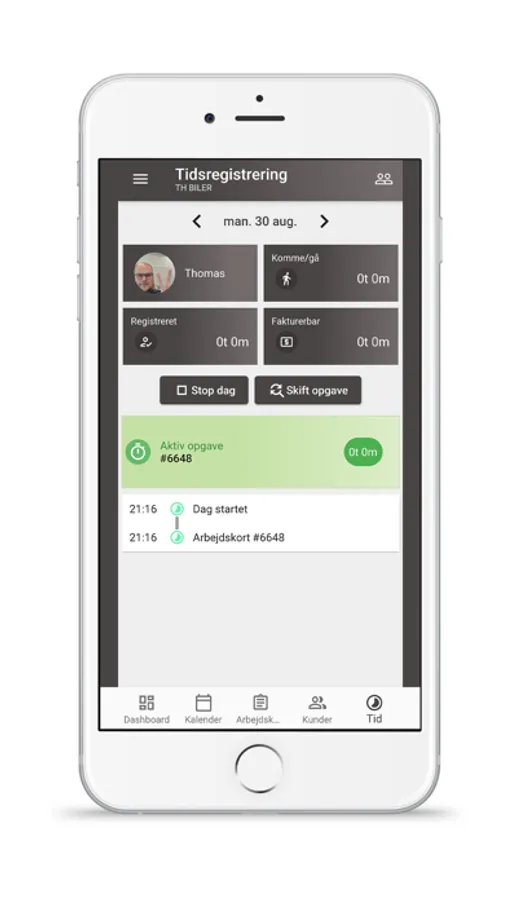 Har du tidsregistrering aktiveret i au2office, så kan du hurtigt og enkelt starte/skifte opgaver i appen.
