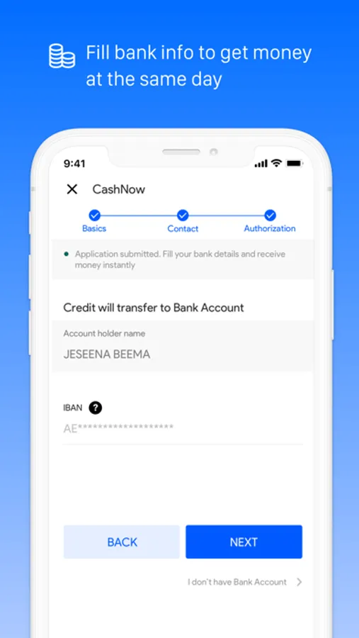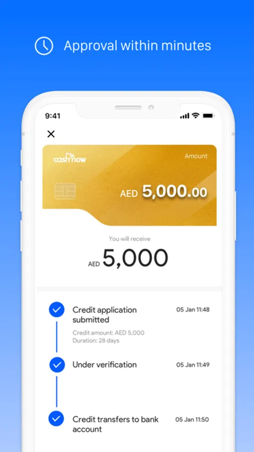 It might only take a few minutes to apply and receive approval. The cash advance application process is quick and simple - upload Emirates ID and follow instructions to complete the procedure. Once the application is approved, money can be instantly transferred to the bank account.
