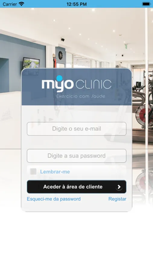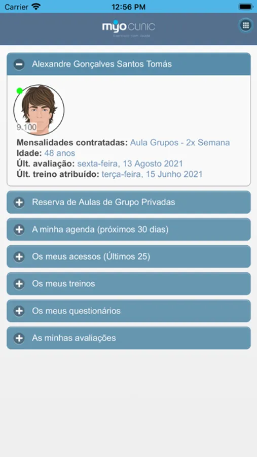 Aplicação do MyoClinic - onde poderá reservar as suas aulas, ver os seus treinos e muito mais.