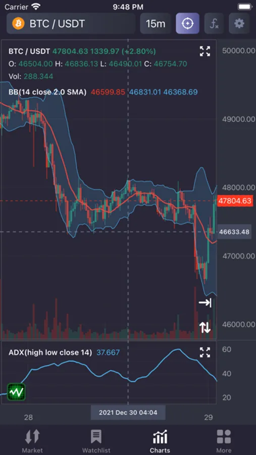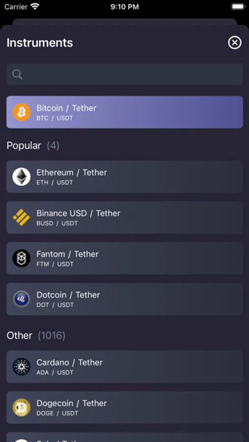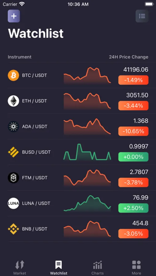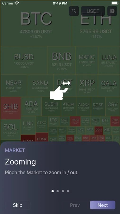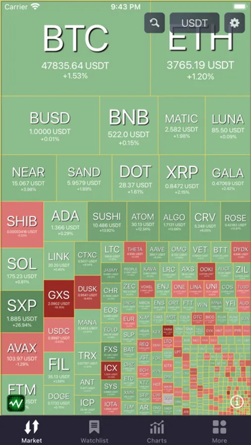 SciTrader is a high-performance cryptocurrency charting app for iOS. Browse the market at a glance to see what coins are performing best with our innovative Market Overview Heatmap. Search for USDT denominated pairs or BTC or ETH to see the top and bottom performers in the crypto market.
