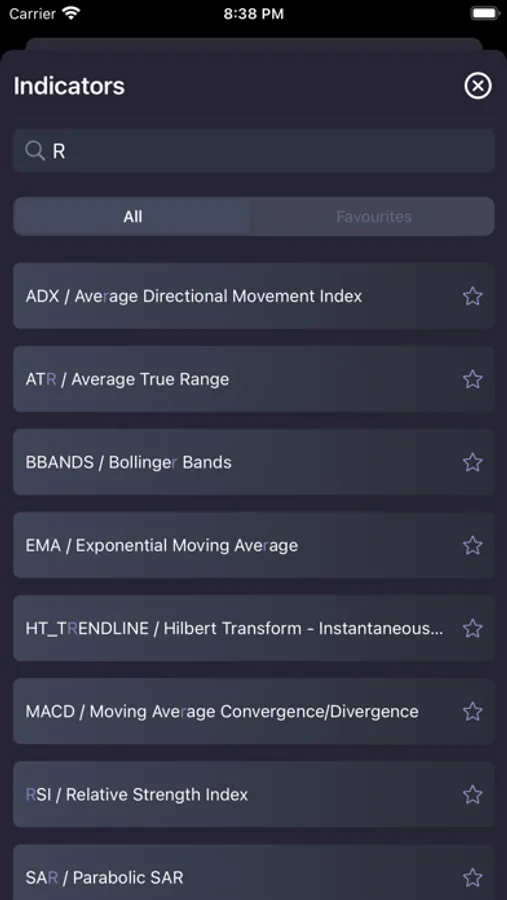 Here you can add technical indicators from a list, including ADX / Average Directional Movement, ATR / Average True Range, Bollinger Bands, CCI / Commodity Channel Index, EMA / SMA Moving averages, Hilbert Transform, MACD / Moving Average Convergence Divergence, OBV / On Balance Volume, RSI / Relative Strength Index, SAR / Parabolic SAR, Standard Deviation and Stochastic Oscillator.