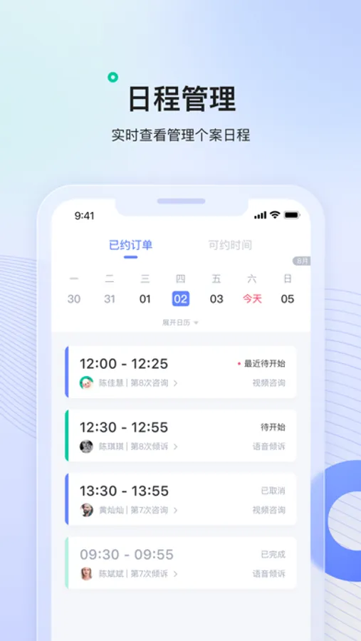 「预约管理」个案预约时间日期清晰明了,修改安排方便快捷。