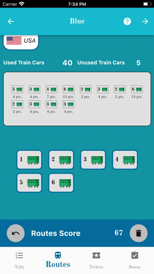 When scoring for routes, you have an undo button for editing. Only lengths for the game board you are playing are shown. Number of train cars left are indicated to validate that all routes were accounted for.