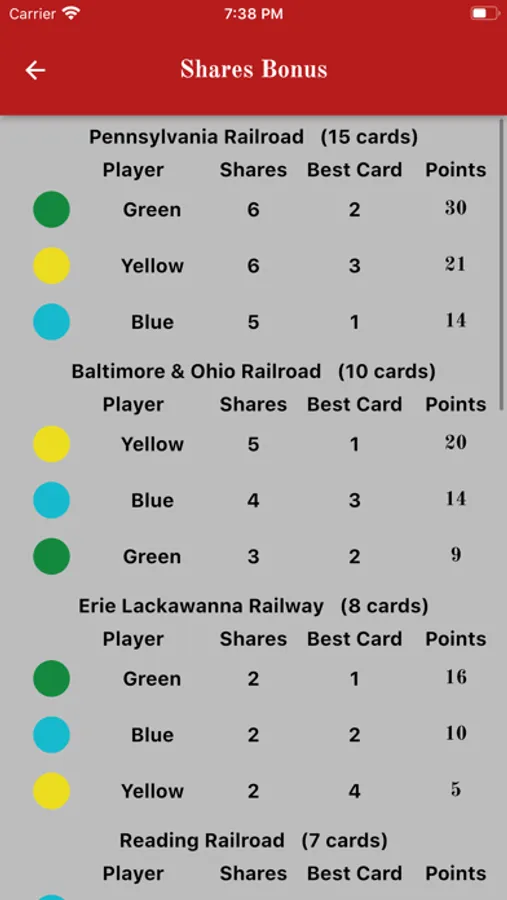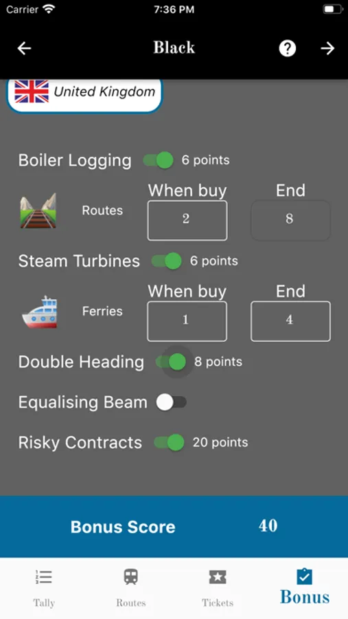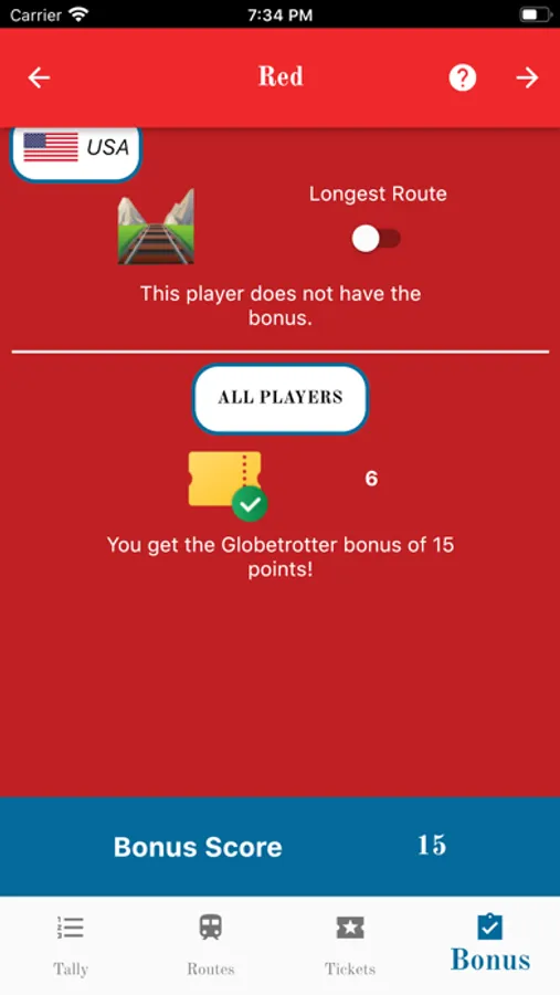 When determining the Longest Continuous Path bonus input longest continuous path in train cars for each player. The bonus corresponding to the specific extension is awarded to the player(s) with the longest continuous path. There is an option to only input the player(s) to be awarded the bonus score and not enter each player's longest path.