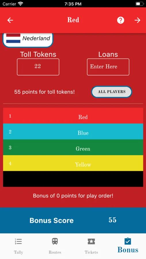 Find in the app help screens that show you how to count scores for each bonus. For all bonuses that depend on the comparison between players the app has views to see how players rank for the bonus.