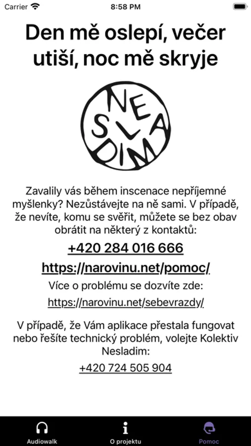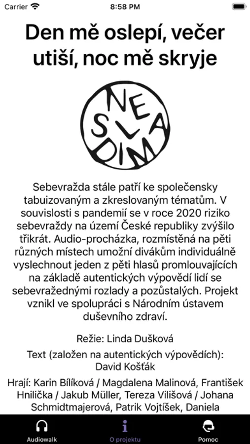Sebevražda stále patří ke společensky tabuizovaným a zkreslovaným tématům. V souvislosti s pandemií se v roce 2020 riziko sebevraždy na území České republiky zvýšilo třikrát. Audio-procházka umožní divákům individuálně vyslechnout jeden z pěti hlasů promlouvajících na základě autentických výpovědí lidí se sebevražednými rozlady a pozůstalých. Ve druhé části se uskuteční performance a společné setkání diváků, tvůrců, psychologů a některých vypovídajících.