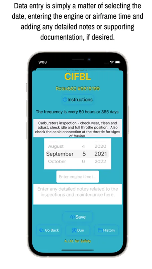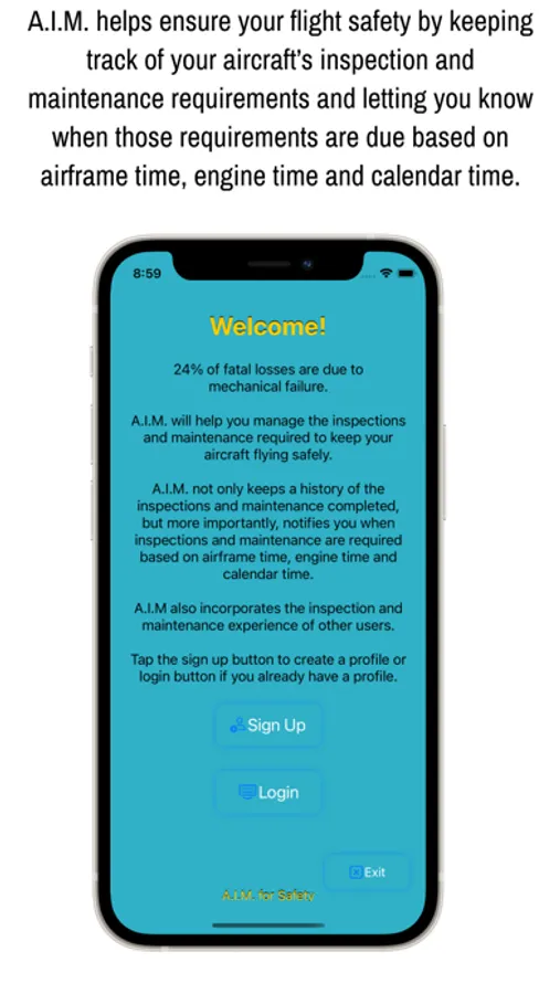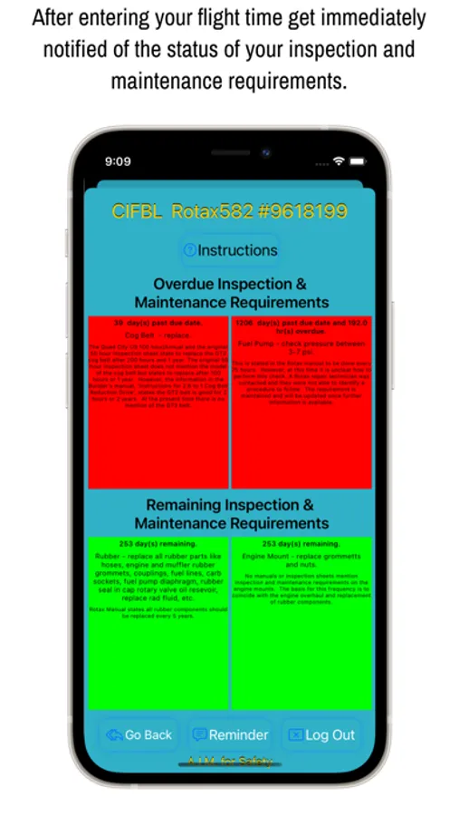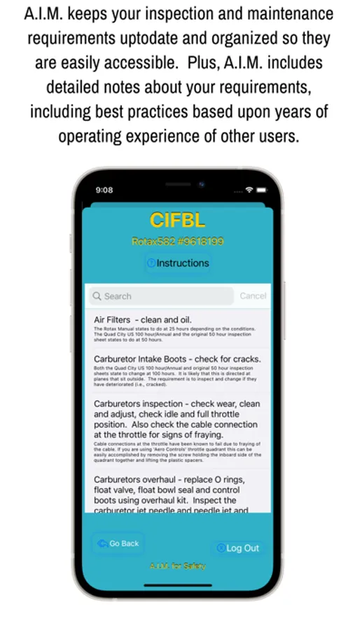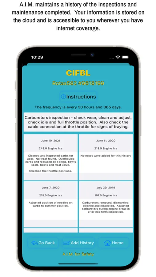 A.I.M. for Safety helps ensure your flight safety by keeping track of your aircraft's inspection and maintenance requirements and letting you know when those inspection and maintenance requirements are due based on airframe time, engine time and calendar time.