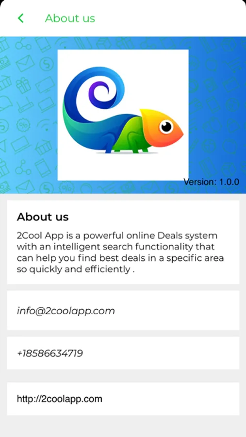 2Cool is a location-based app that shows you the stores, discounts and deals CLOSEST TO YOU! You can search for your next destination to plan ahead, you can “FAVORITE” businesses you like to easily find them later. Share any business, offer or deal with a click via WhatsApp, SMS, Email, Facebook, Instagram, Skype, etc.