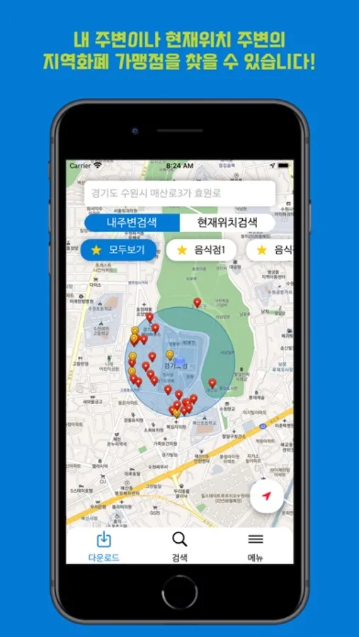 '경기지역화폐지도'는 지도를 통해 내 주변 점포들을 볼 수 있고 검색을 통해 해당하는 가맹점인지 확인 할 수 있습니다.
