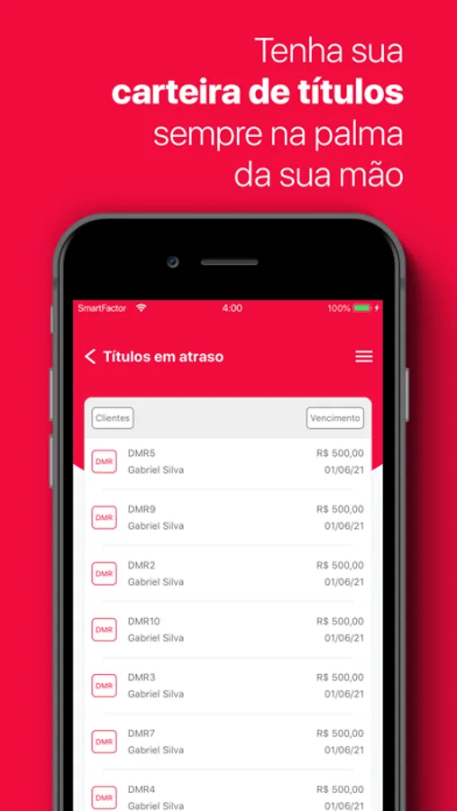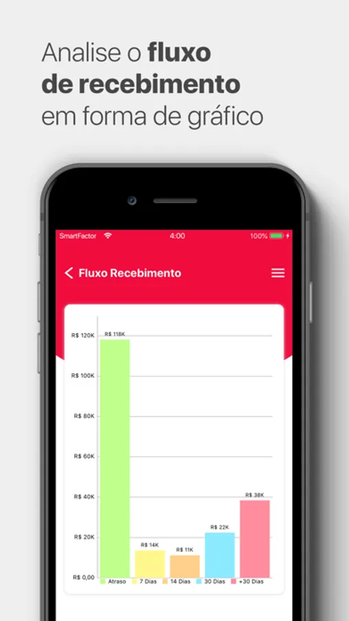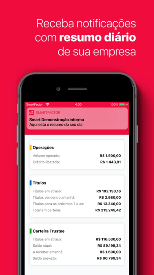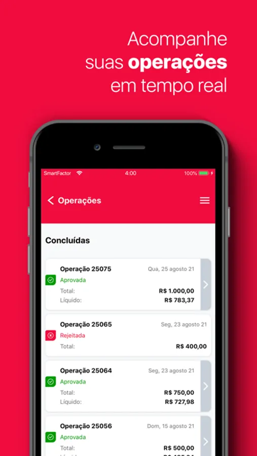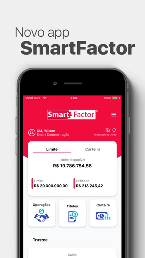 O aplicativo do SmartFactor permite acesso a consulta de operações, acompanhamento de carteira, fluxo de recebimentos, extrato e performance do dia.
