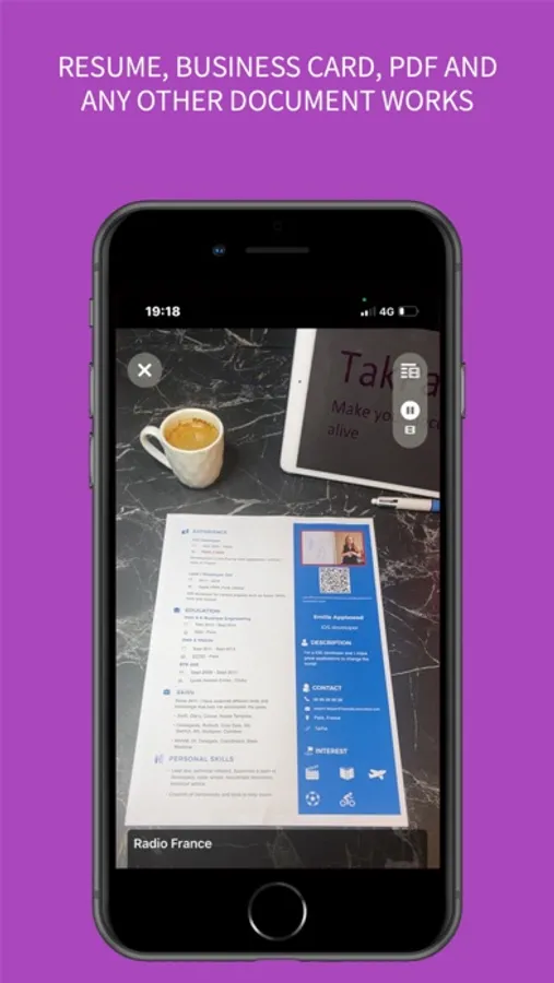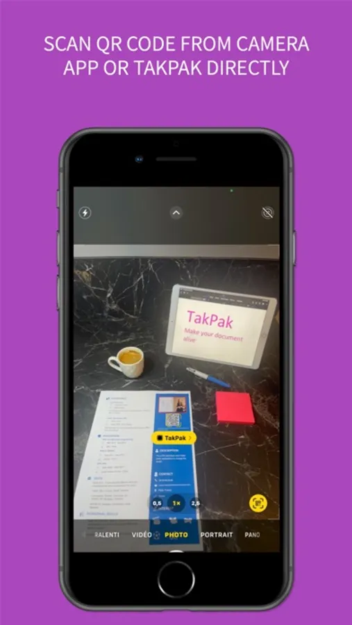 4. Users scan the QR Code with their device's Camera app or directly with the TakPak app. Then the camera of the device, obtain the information in augmented reality and overlay of the document
