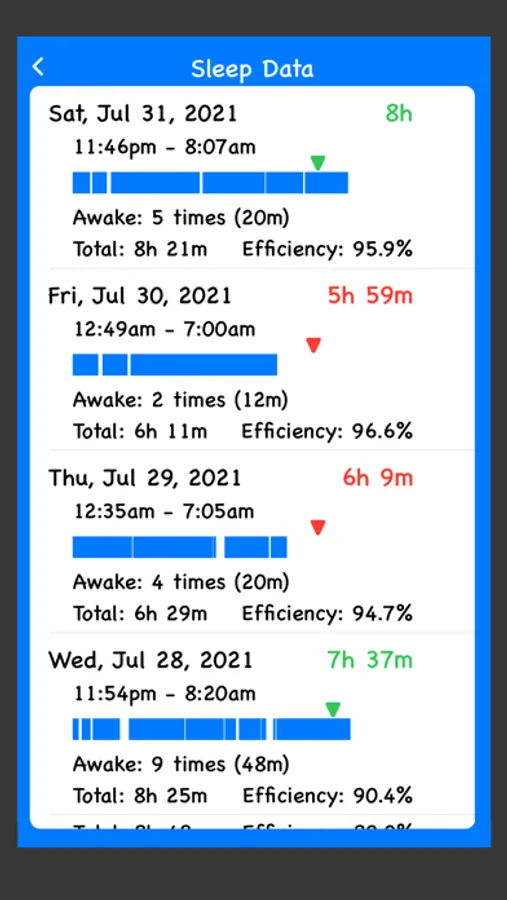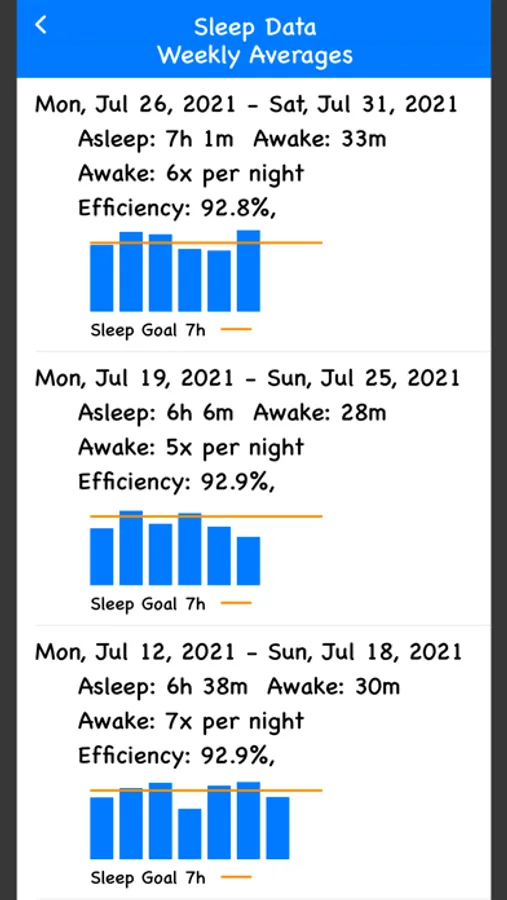 SleepTech has no ads and no subscriptions. Just select a date range and view details, averages and charts of your sleep. See how efficient your sleep is, make minor adjustments to your habits if you choose, and track your progress towards your goal.