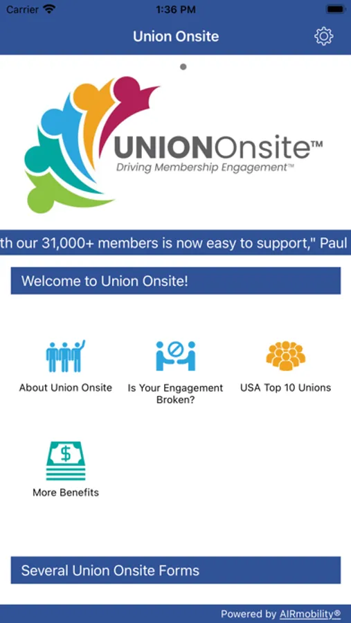 Union Onsite is a leading communications platform that helps unions engage their members. This includes push notification messaging by title, area, chain or store, distribution of all commonly used documents, a custom live news feed and news ticker, no-code application interface, a no-code digital form creator with hundreds of features (barcode scanning, photo capture, drop-down lists, conditional form logic, graphics, embedded documents and graphics, pagination and much more). If you have 200 members or 1 Million, our cloud services can support any organization of any size.
