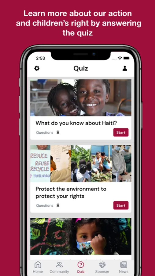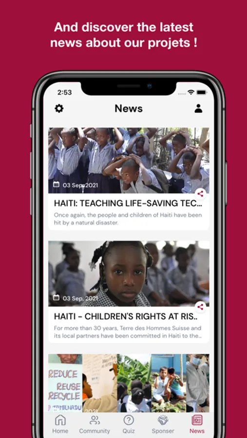 Each year, Terre des Hommes Suisse organizes different kind of charity sports events in Switzerland (la Marche de l’espoir, Nager pour aider) offering people an opportunity to play some sport while committing to children's rights. This application offers on online alternative for people for cannot attend these events in person but are still willing to take part. Thanks to this application, which integrates the Health app and CareKit functionalities, participants can walk, run on bike and engage in the challenge of their choice, at their own pace and become actor of change in the defense of children rights. Join us now!