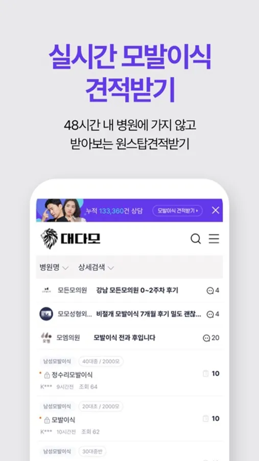 48시간 이내에 앱을 통해 병원에 가지 않고 모발이식 견적 확인이 가능합니다.