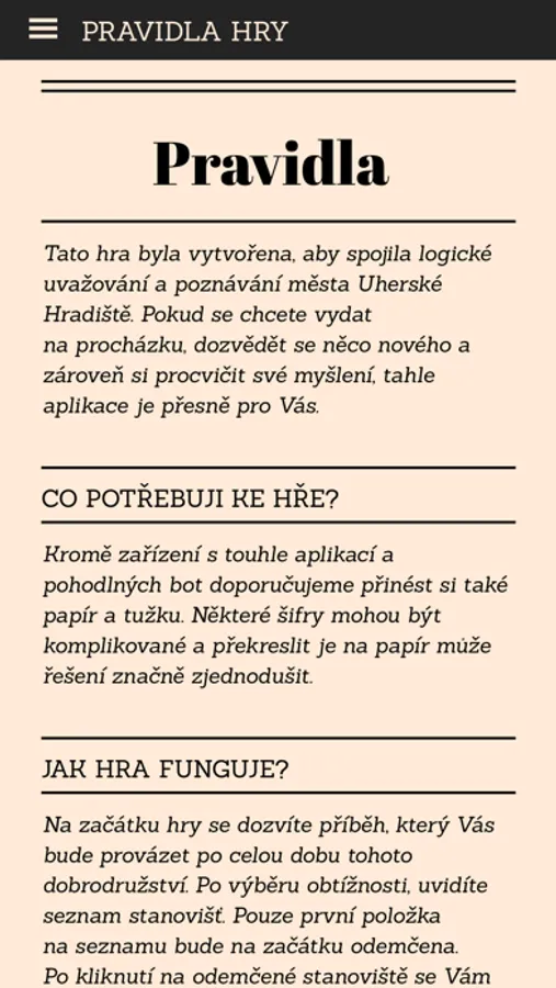 Tato hra byla vytvořena, aby spojila logické uvažování a poznávání města Uherské Hradiště. Pokud se chcete vydat na procházku, dozvědět se něco nového a zároveň si procvičit své myšlení, tahle aplikace je přesně pro Vás.