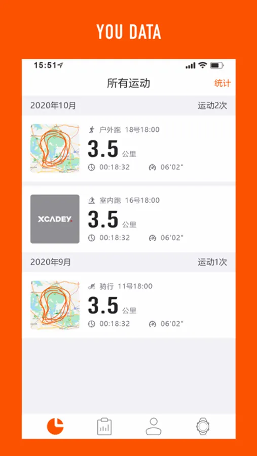 XCADEY APP保存并展示您所有运动及健康数据,从消耗的卡路里和步数,到更深入的统计数据,如每次运动的心率等,为您提 供完美的数据分析工具。